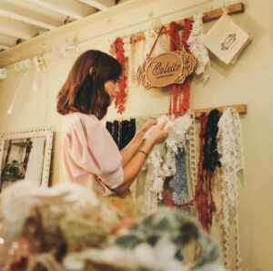 Trabajo con técnicas de upcycling artesanal en mi taller del barrio del Born de Barcelona, respetando los detalles del encaje original y fusionándolos con metales y acabados actuales.