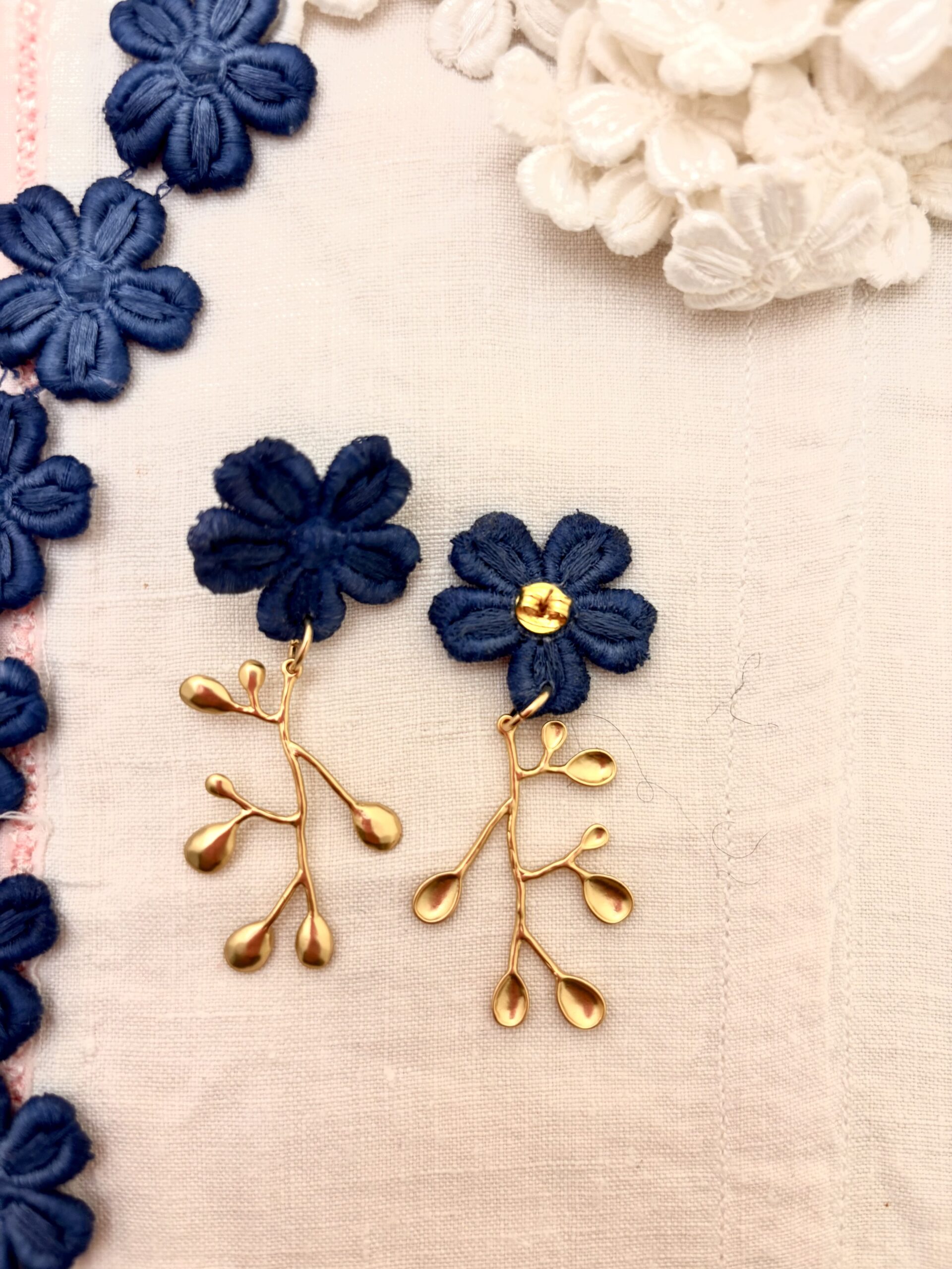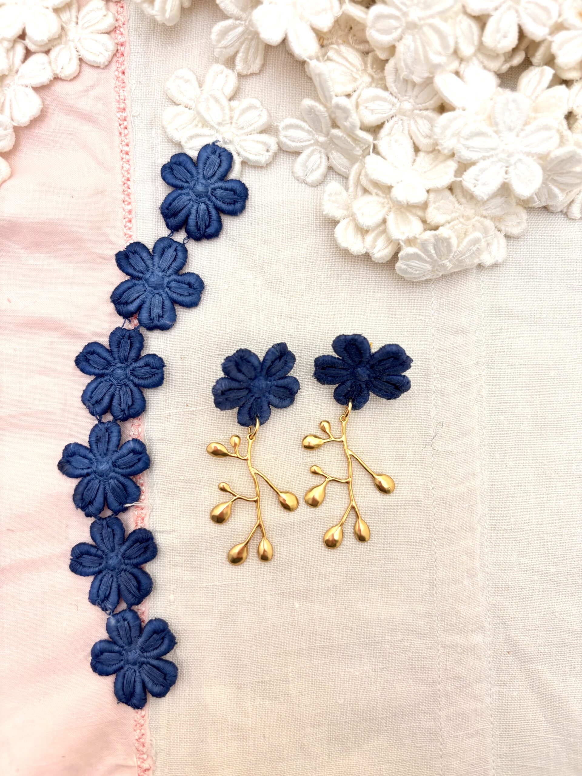 Cada par de pendientes está creado a partir de estas flores de encaje antiguo recuperado, cuidadosamente seleccionadas y combinadas con una delicada rama antigua bañada en oro, que aporta estructura y luz a la pieza. El resultado es una joya ligera, femenina y llena de carácter.