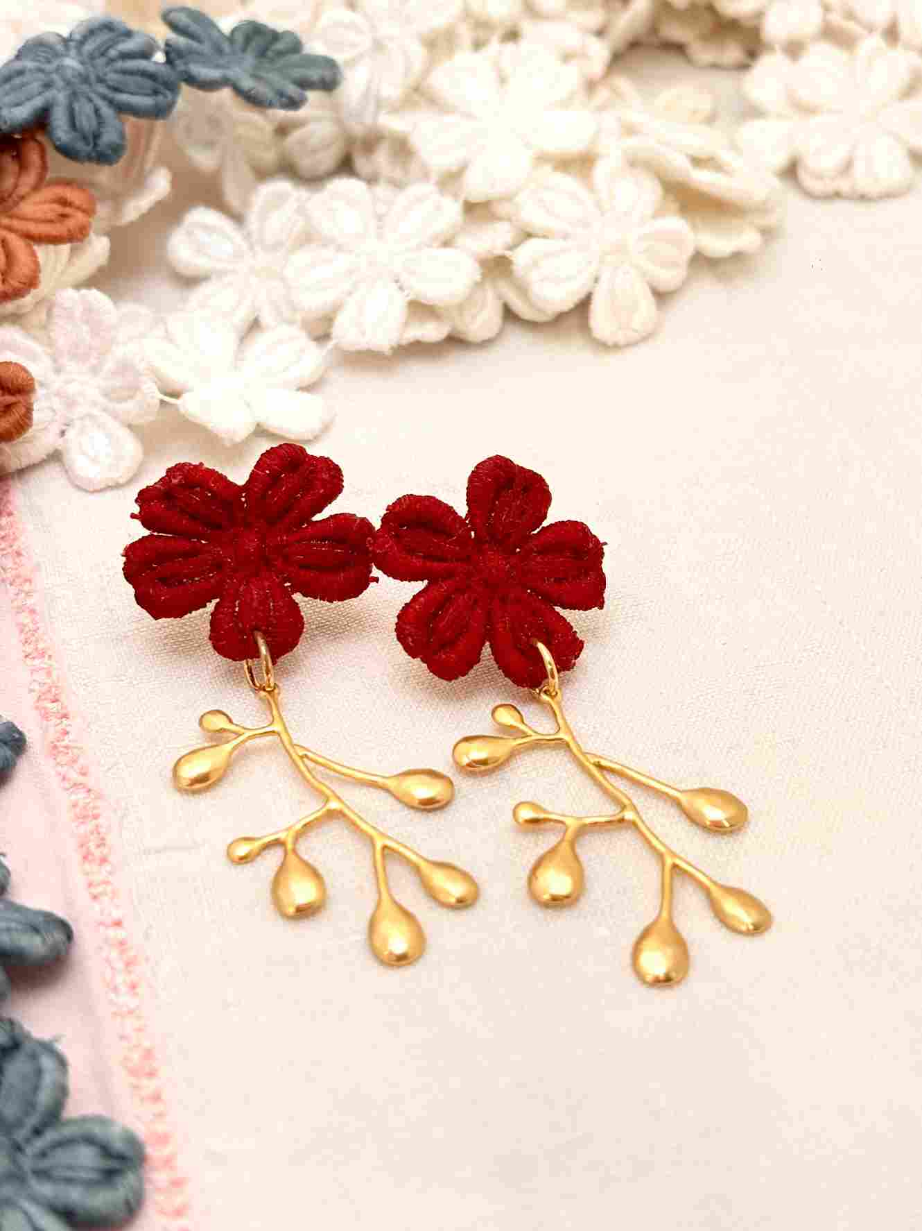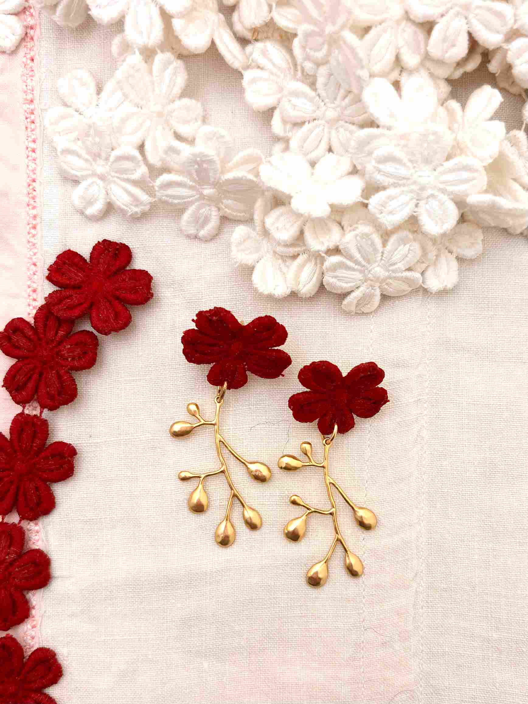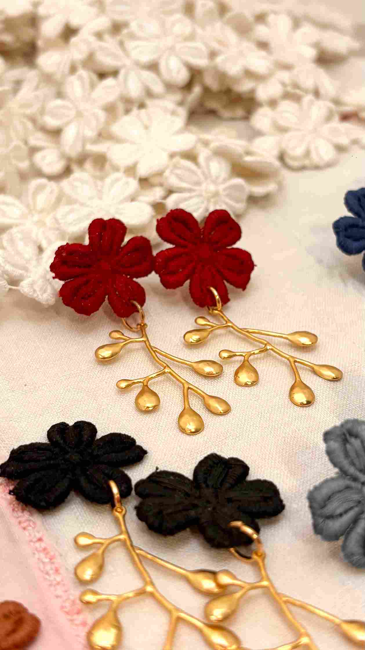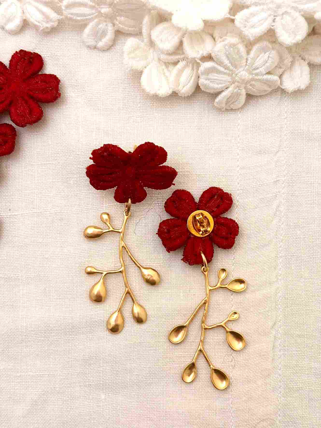 Cada par de pendientes está creado a partir de estas flores de encaje antiguo recuperado, cuidadosamente seleccionadas y combinadas con una delicada rama antigua bañada en oro, que aporta estructura y luz a la pieza. El resultado es una joya ligera, femenina y llena de carácter.