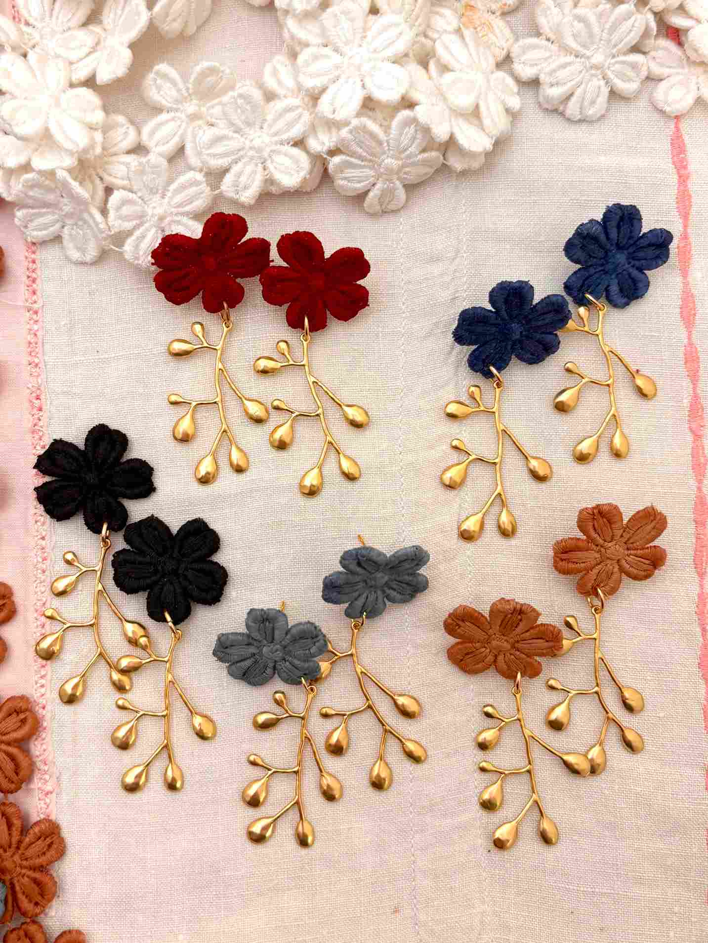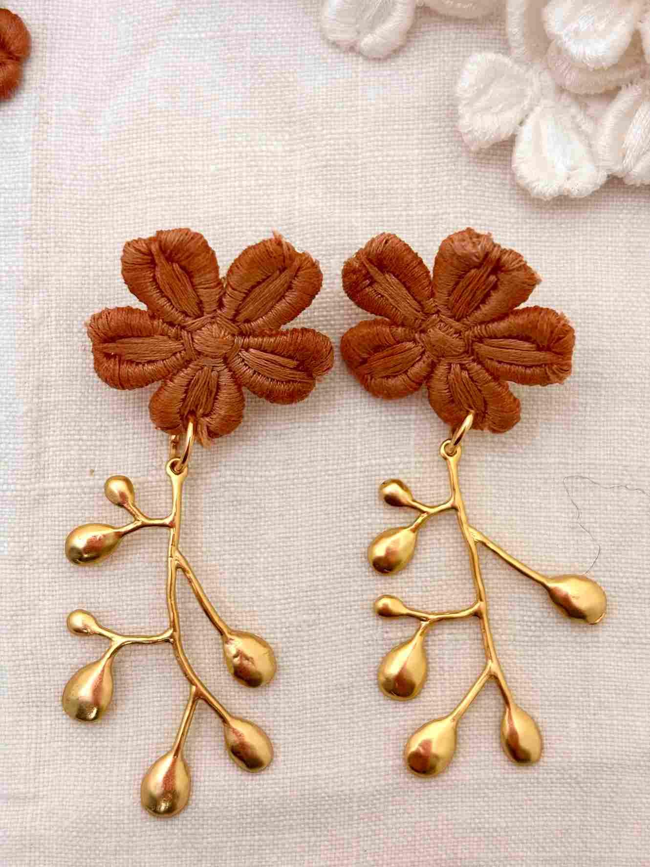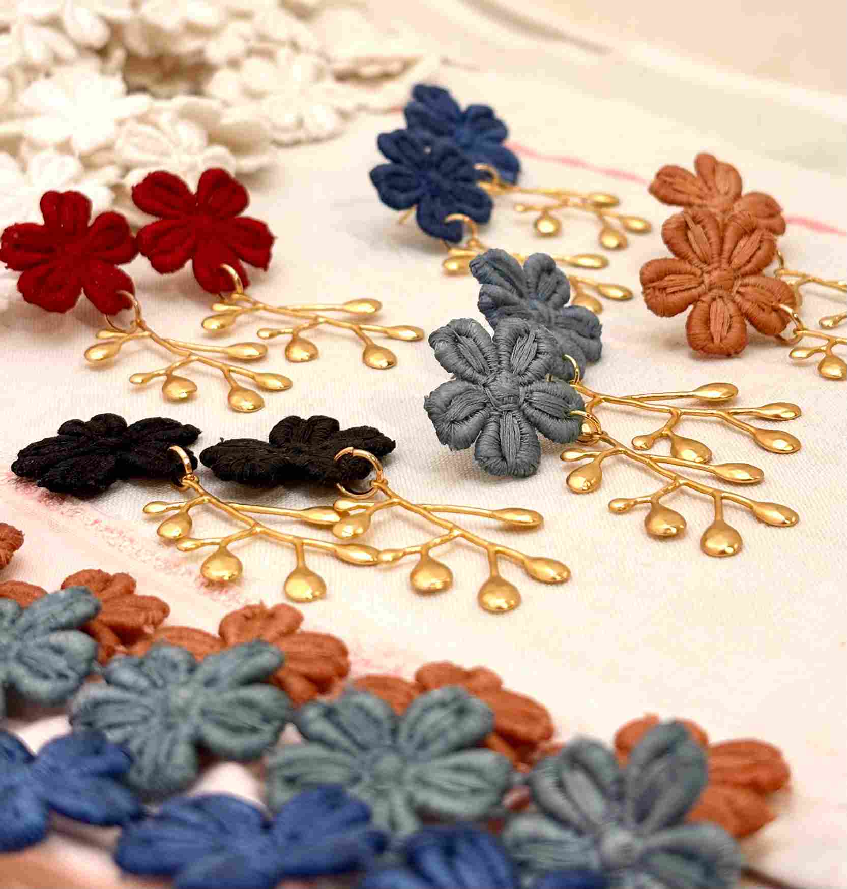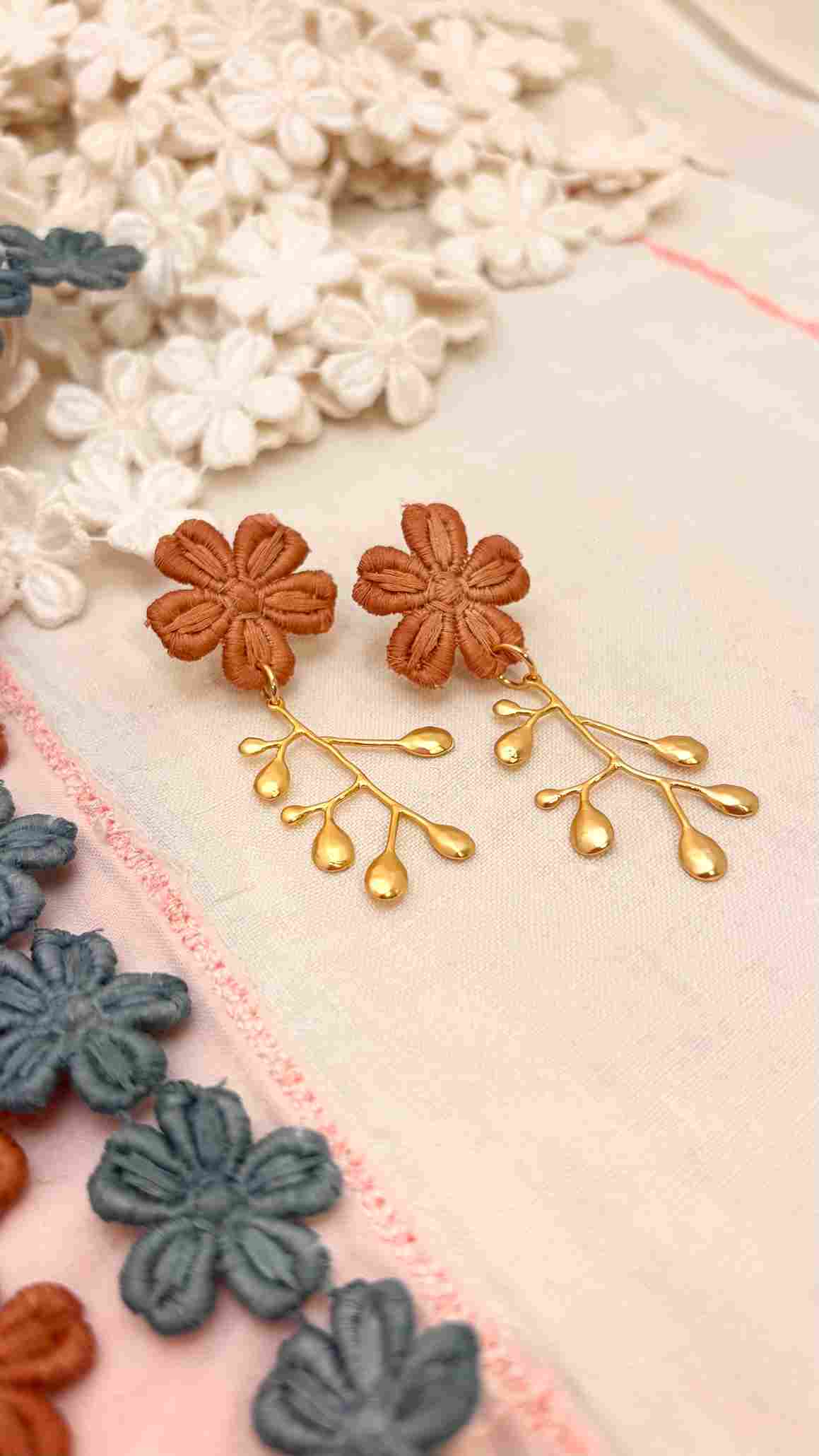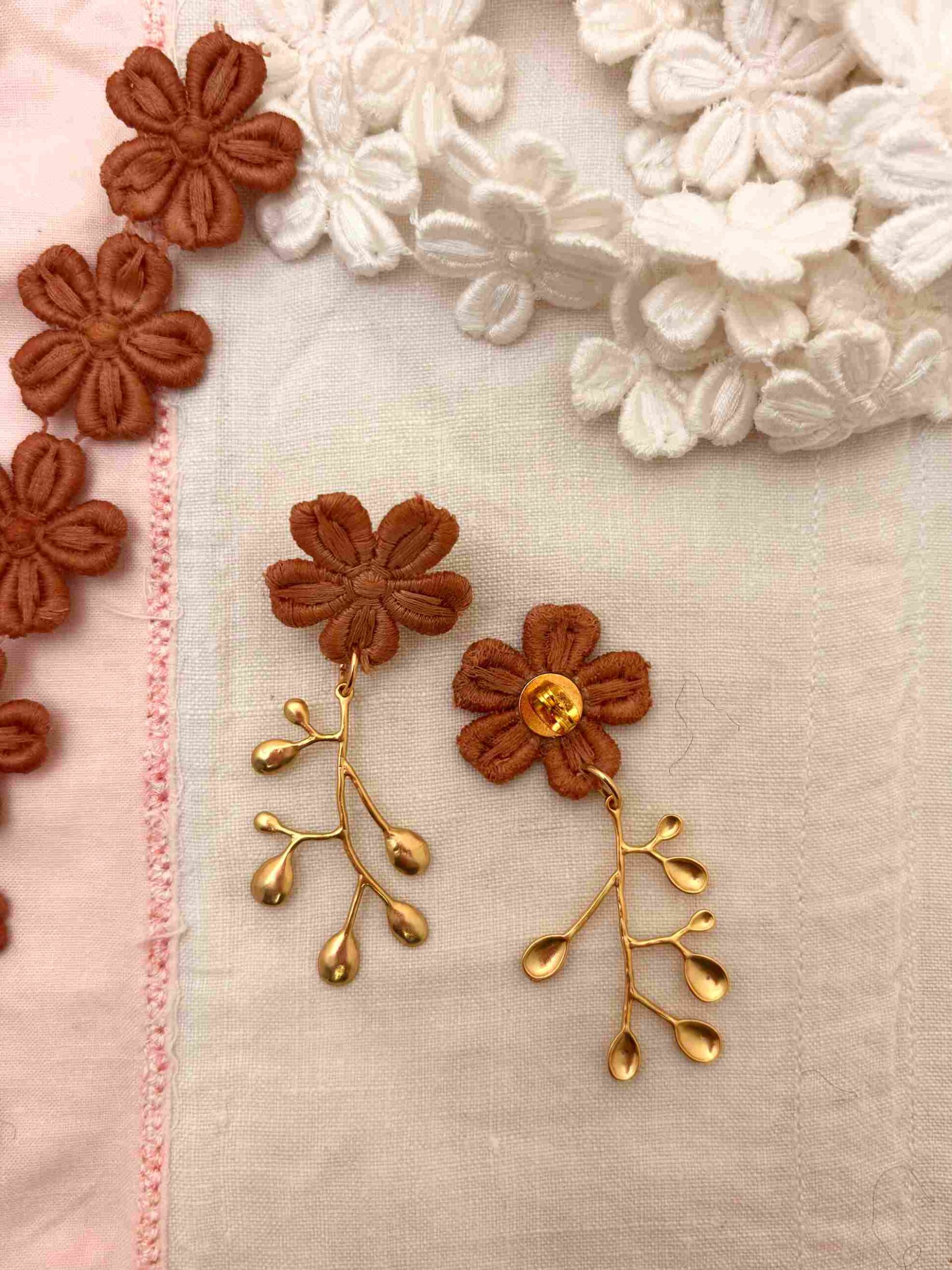 Cada par de pendientes está creado a partir de estas flores de encaje antiguo recuperado, cuidadosamente seleccionadas y combinadas con una delicada rama antigua bañada en oro, que aporta estructura y luz a la pieza. El resultado es una joya ligera, femenina y llena de carácter.