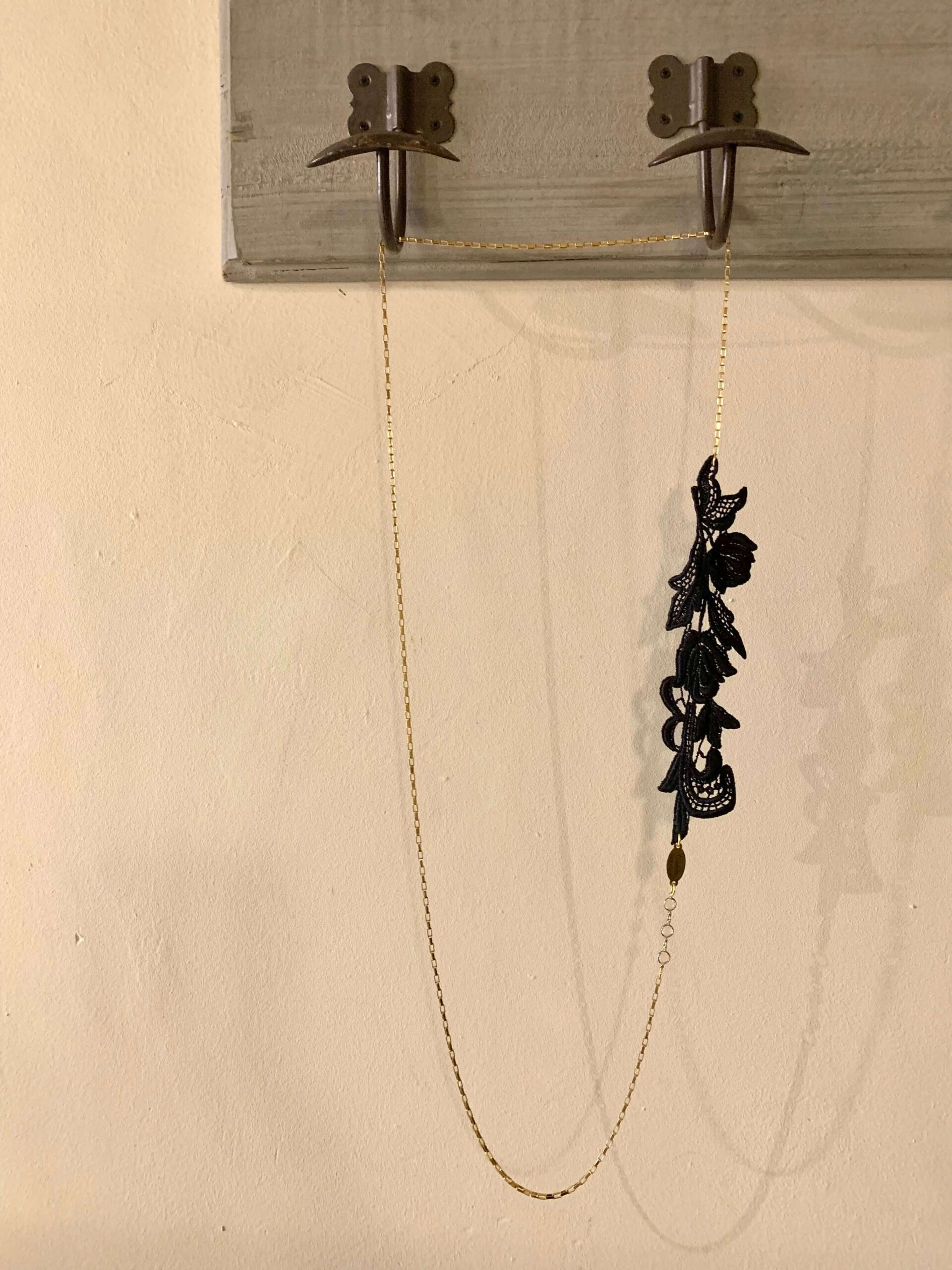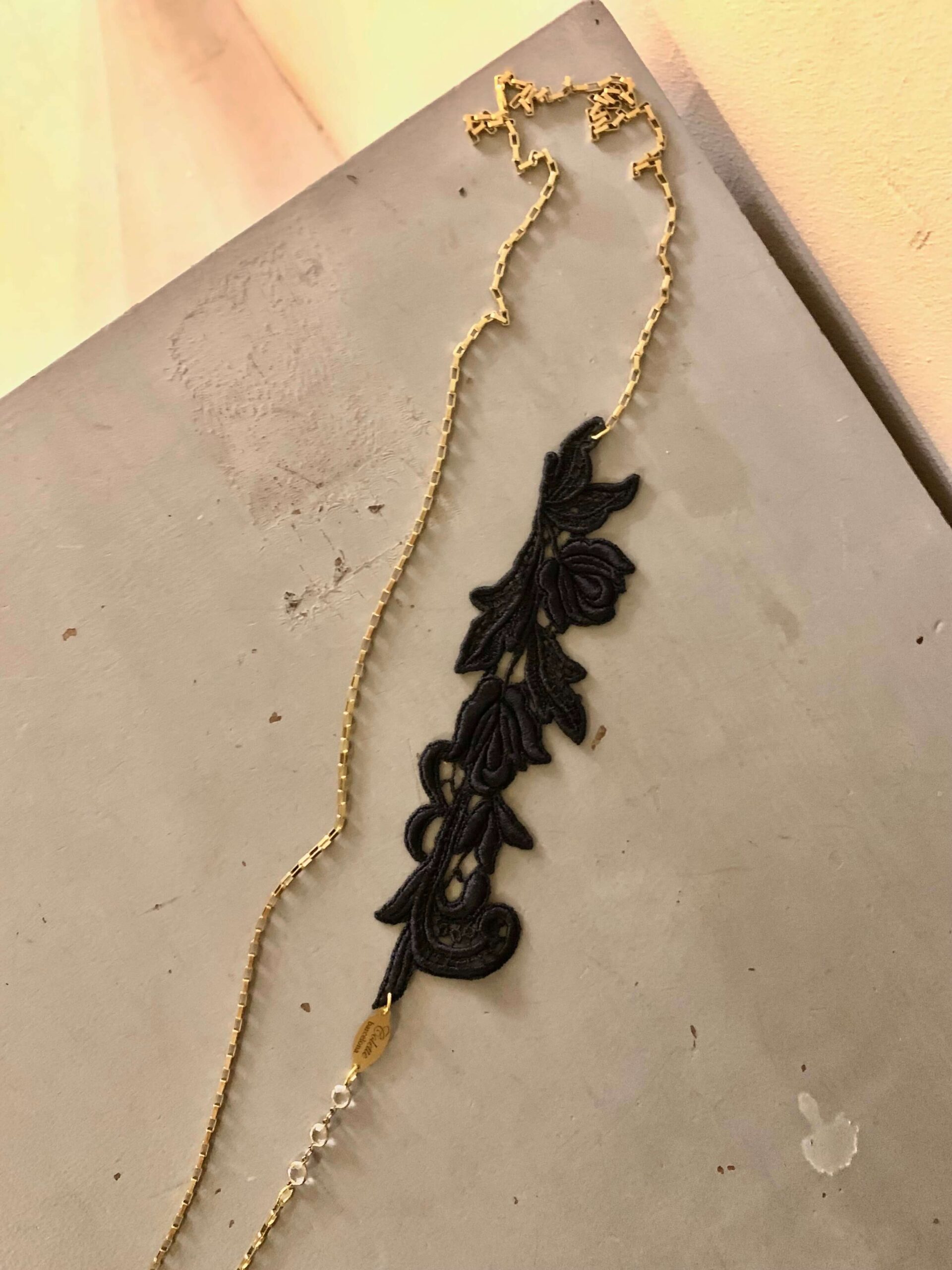 Cada pieza del Collar Carlota encierra una historia de realeza textil. Está creado a partir de encaje de guipur de los años 70, recuperado y teñido artesanalmente en negro, para conservar su delicadeza y darle un nuevo poder. Un material noble que, al renacer, simboliza la transformación y la belleza atemporal.