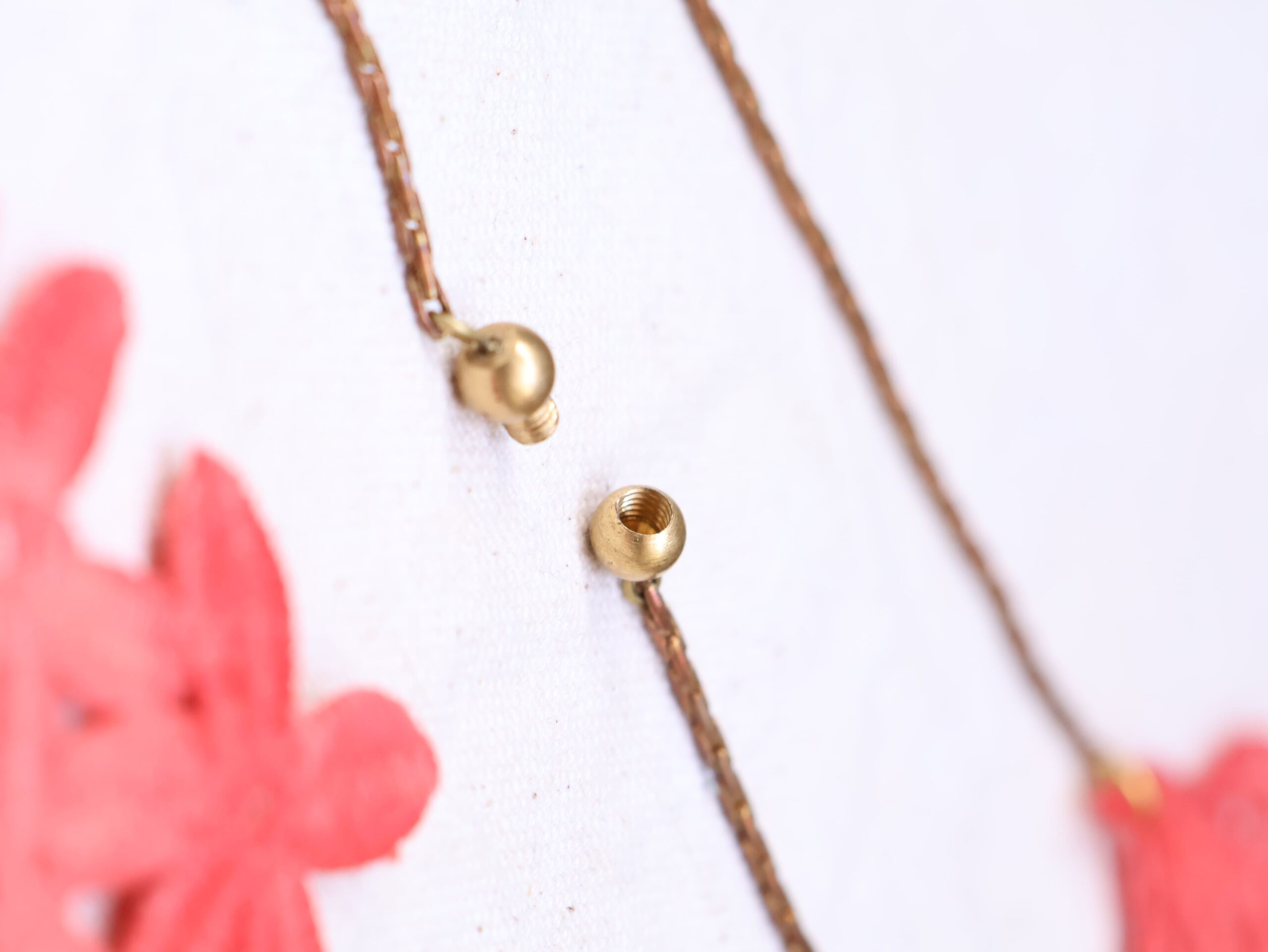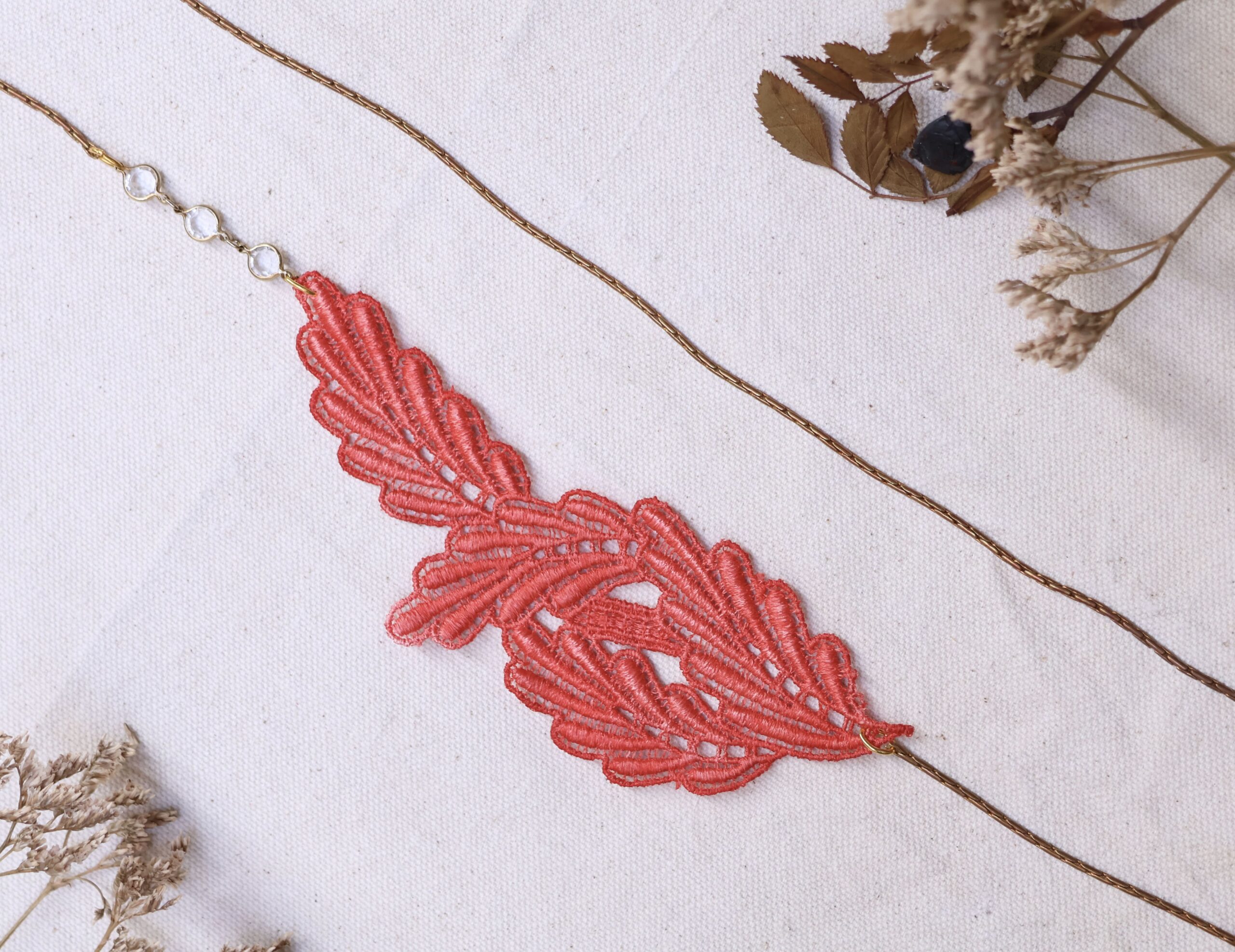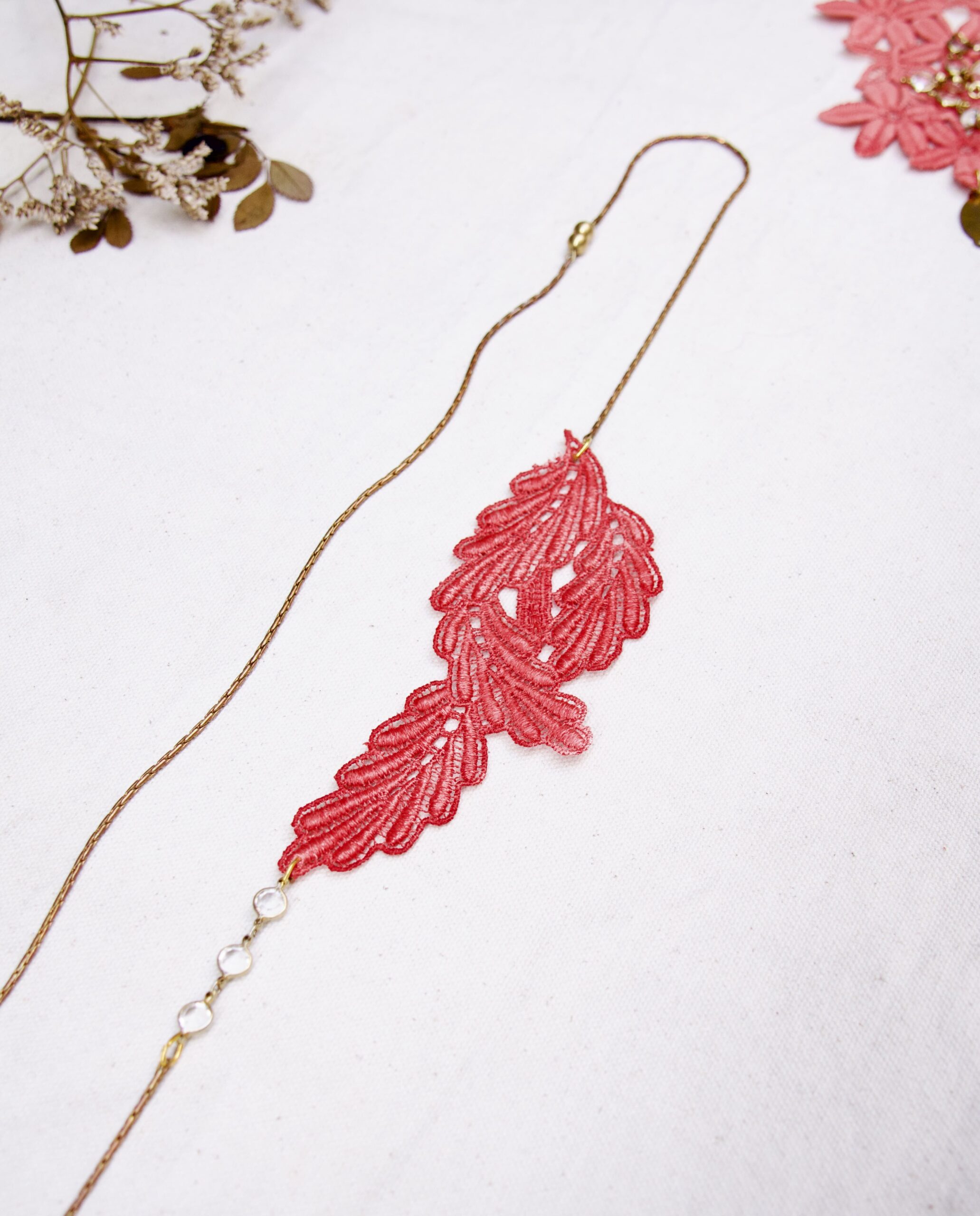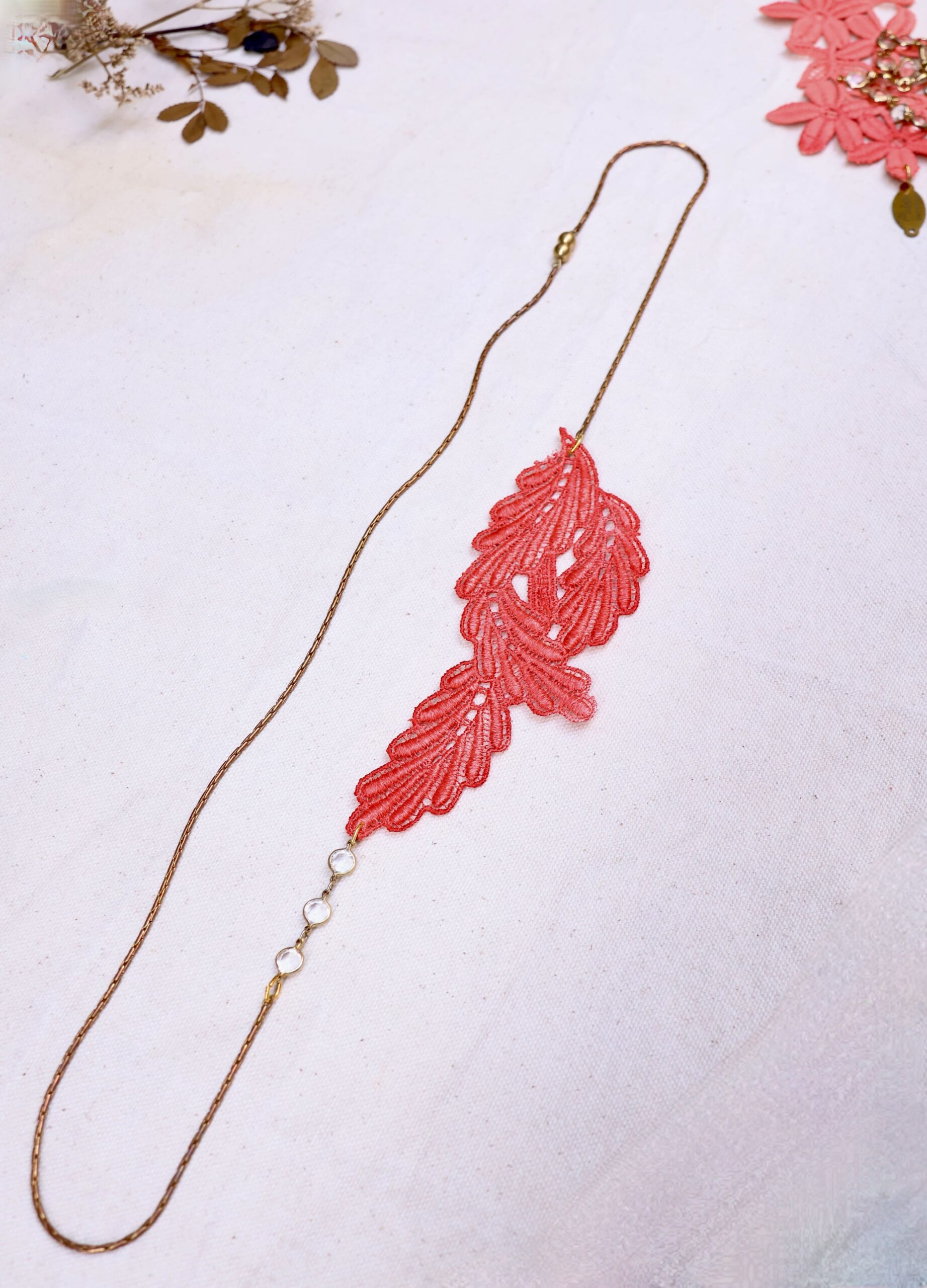 Décadas después, esos hilos volvieron a respirar. Al descubrirlos, me conmovió su historia dormida: estaban pensados para celebrar comienzos, pero nunca llegaron a cumplir su propósito. Decidí entonces darles una segunda vida, fiel al espíritu de upcycling que define mi trabajo. Corté una a una las hojas que me enamoraron, siguiendo su forma natural, y las transformé en un collar único.