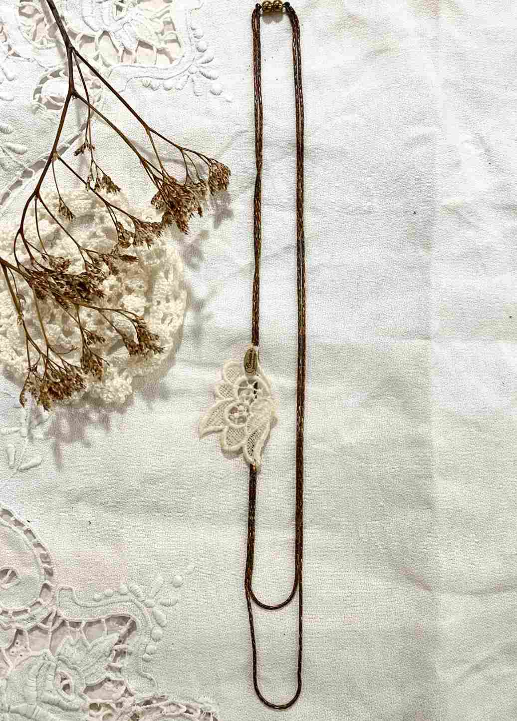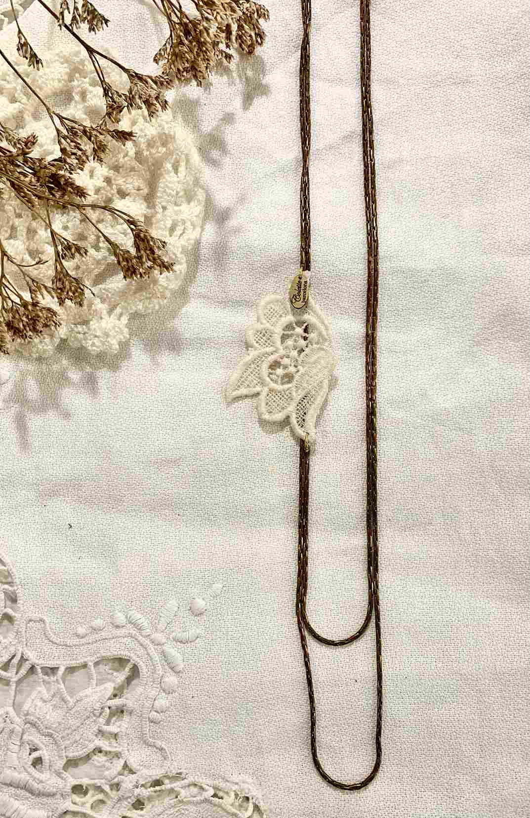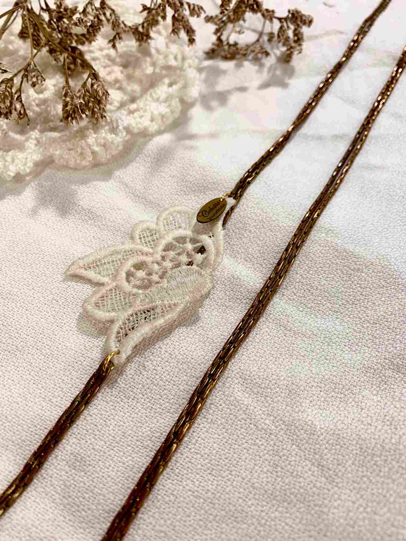 La flor es de encaje de guipur originalmente era un tejido nupcial de los años 80’.En  Colette Barcelona lo hemos rescatado y le hemos dado una nueva vida. En forma de collar.