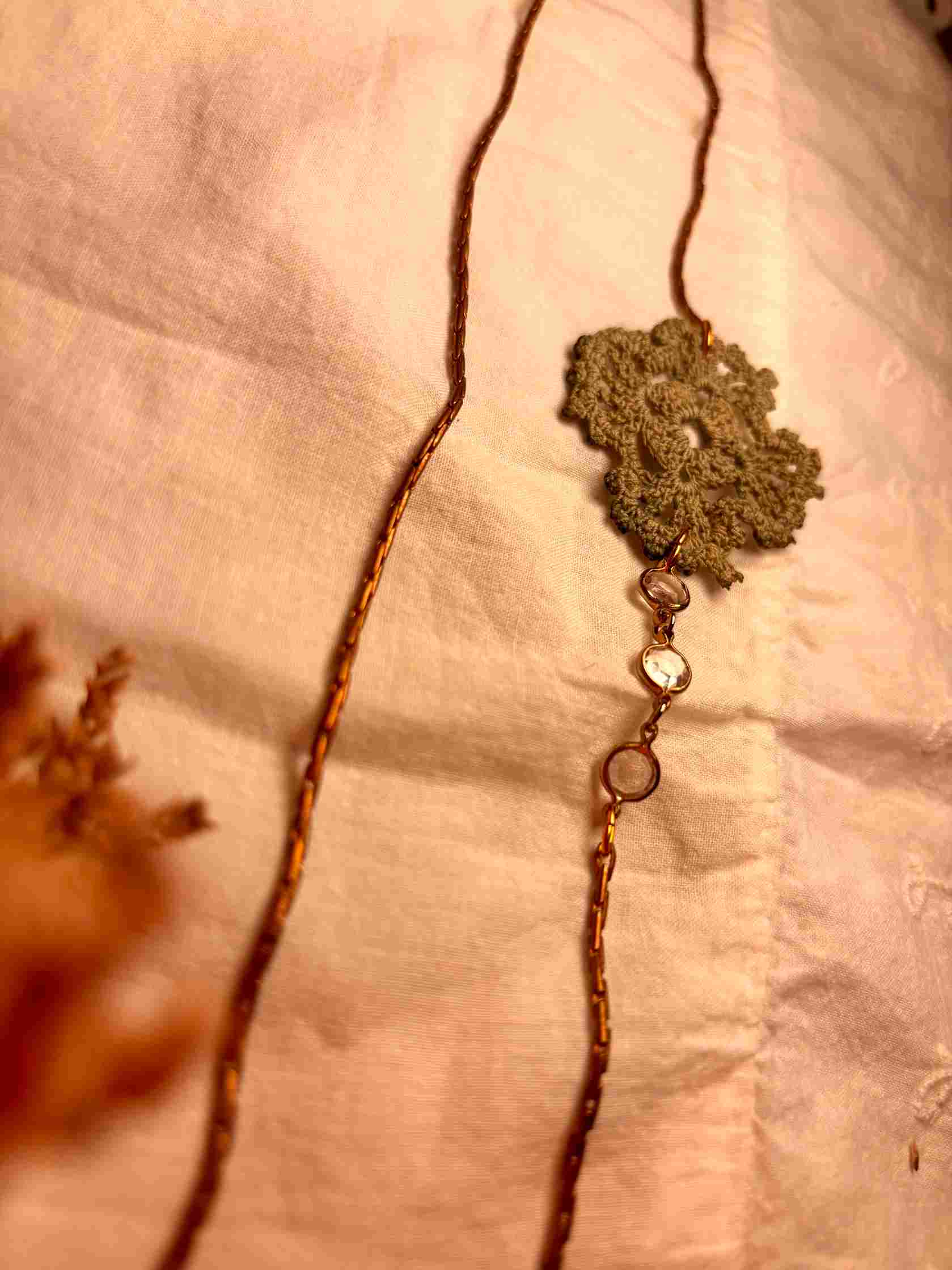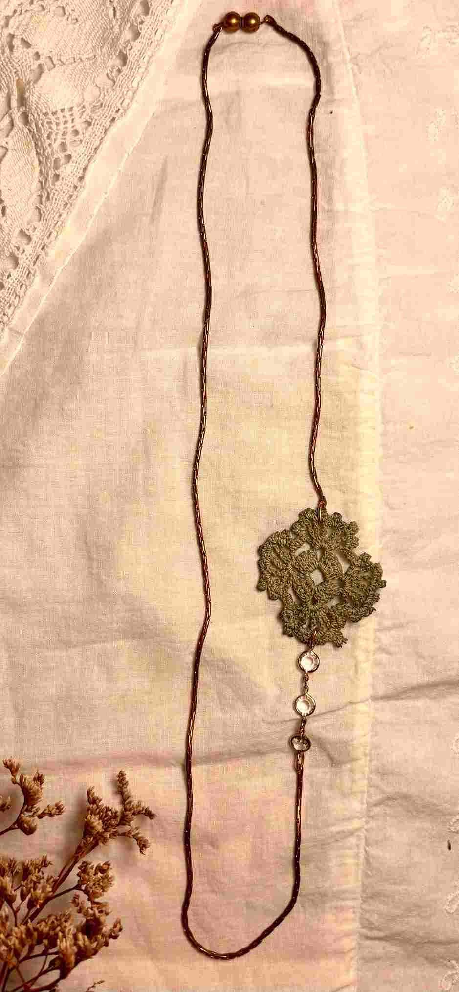 Es un collar semilargo con una pequeña flor en forma de Tapete Verde. Es ligero y original. Aportando elegancia a tus looks. El collar tiene unas pequeñas bolitas decorativas transparentes. En realidad es una cadena vintage que he rescatado para poder hacer una combinación más elegante y chic. Su particularidad es que antes era un tapete hecho por alguna mujer del pasado y hoy es un collar transformado.